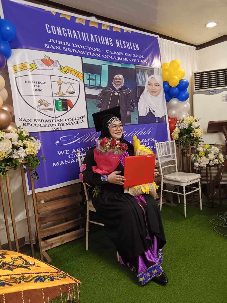 It is with great joy and heartfelt congratulations that we celebrated yesterday the remarkable achievement of Nesreen Cadar Hamdag Mama-o Abdurauf, who has earned the distinguished title of Juris Doctor from San Sebastian. Her journey is a testament to perseverance, dedication, and the unwavering support of her loving family.
